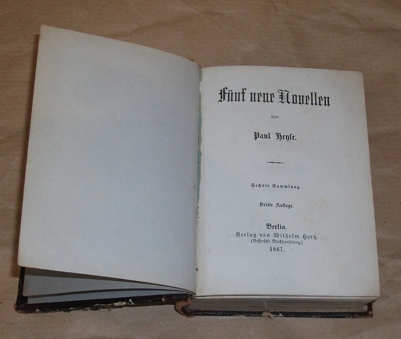 Heyse, Paul: Fünf neue Novellen. Sechste Sammlung. 3. Aufl. Berlin: Hertz, 1867. 14 cm, 400 S. Altdeutsche Schrift. HLdr. Einband mit starken Gebrauchsspuren (berieben / bestoßen). Etwas schief gelesen, Schnitt gebräunt u. fleckig.
