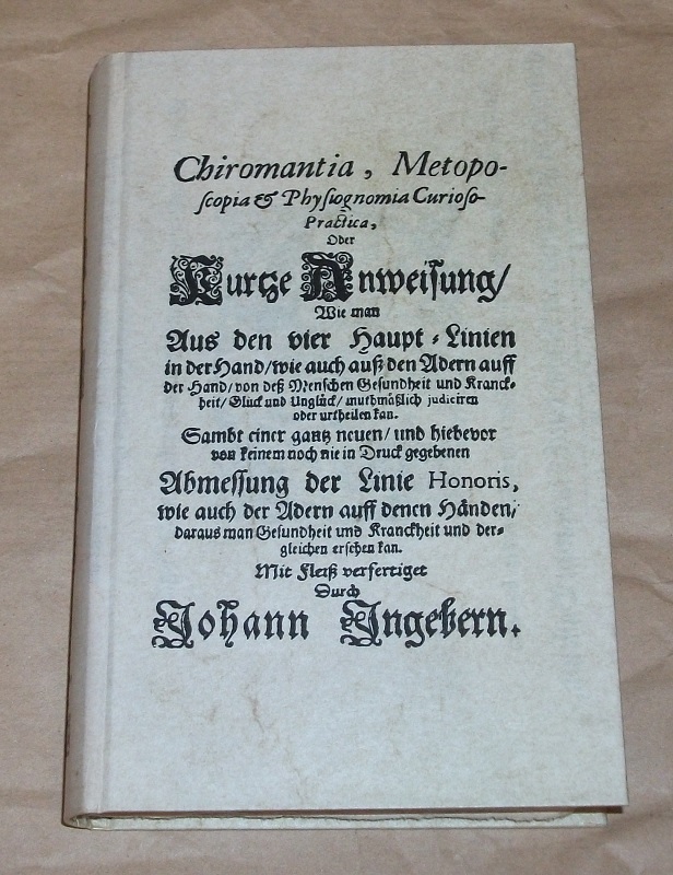 Ingeber, Johann: Chiromantia, metoposcopia & physiognomia curioso-practica, oder kurtze Anweisung, wie man aus den vier Haupt-Linien in der Hand, wie auch auss den Adern auff der Hand von dess Menschen Gesundheit und Kranckheit, Glück und Unglück muthmässlich judiciren oder urtheilen kan. sambt e. gantz neuen, u. hiebevor von keinem noch nie in Druck gegebenen Abmessung d. Linie honoris, wie auch der Adern auff denen Händen, daraus man Gesundheit u. Kranckheit u. dergleichen ersehen kan. Unveränd. Nachdr. [d. Ausg.] Franckfurt am Mayn, Ehrling, 1692. Darmstadt: Bläschke, o.J. 18,5 cm, 180 S. Ill. Ppd. Schnitt etw. braunfleckig (auch Reprint?), unbeschnitten. Leichte Gebrauchsspuren.