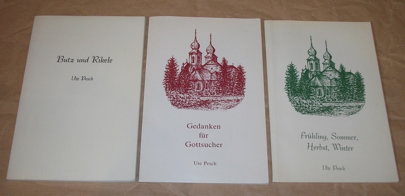 Pesch, Ute: Butz und Rikele / Gedanken für Gottsucher / Frühling, Sommer, Herbst, Winter. 3 Bände. Überlingen: Pesch 1984 / o.J. 20 cm, n.n.S. Ein Band mit Ill. von Erich Trautwein. Kart. Band Frühling…Einbandvorderseite mit Knickspur, Widmung a. V. Sonst leichte Gebrauchsspuren.