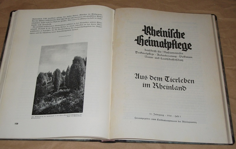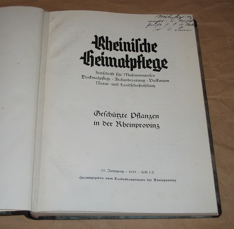 Landeshauptmann der Rheinprovinz (Hrsg.): Geschützte Pflanzen in der Rheinprovinz / Aus dem Tierleben im Rheinland. Rheinische Heimatpflege. Zeitschrift für Museumswesen, Denkmalpflege, Archivberatung, Volkstum, Natur- und Landschaftsschutz. 11. Jahrgang 1939 Heft 1/2 / 10. Jahrgang 1938 Heft 1. In einem Band zusammengebunden. Düsseldorf: 1938 / 39. 25 cm, 158 / 106 S. mit Abb. HLn. mit Rückenbeschriftung Pflanzen und Tiere im Rheinland. Rückenbeschriftung z.T. abgerieben. Schnitt gebräunt. Name a. V. , Widmung a. T.