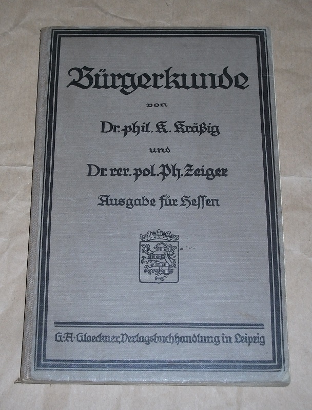 Kräßig, Konstantin u Ph. Zeiger: Bürgerkunde. Ausgabe für Hessen. 2. Aufl. Leipzig: Gloeckner, 1928. 22 cm, 135 Seiten m. Ill. HLn. Einbandkanten / Ecken bestoßen, Einband u. Schnitt gebräunt u. etw. fleckig. z.T. Anmerkungen / Ergänzungen mit Bleistift, Name a. V.