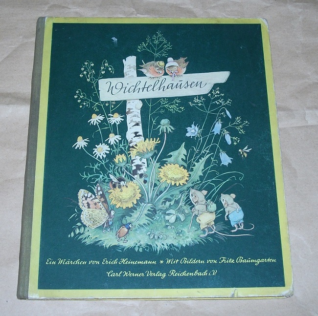 Heinemann, Erich / Baumgarten, Fritz (Ill.): Wichtelhausen. Ein Märchen. 1. Auifl. Reichenbach i. V.: Werner, 1946. 24 cm. 36 Seiten Ill. HLn. Einbandkante / -ecken bestoßen / berieben. Schnitt braunfleckig, innen etw. fleckig. Auf S. 36 sw-Zeichnung z.T. mit Buntstift angemalt. Insgesamt gut erhalten.