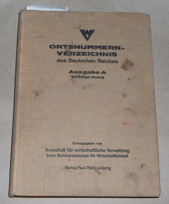 Ortsnummern-Verzeichnis des Deutschen Reiches. Ausgabe A Vorläufiger Auszug. Hrsg. vom Ausschuß für wirtschaftliche Verwaltung beim Reichskuratorium für Wirtschaftlichkeit. Leipzig: Paul Räth 1927 21,5 cm, 428 S. Ln. Einband und Schnitt fleckig. Ecken etw. bestoßen. Mit eingeklebtem Widmungszettel der Dresdner Bank zum Neujahr 1928 auf dem Vorsatz.