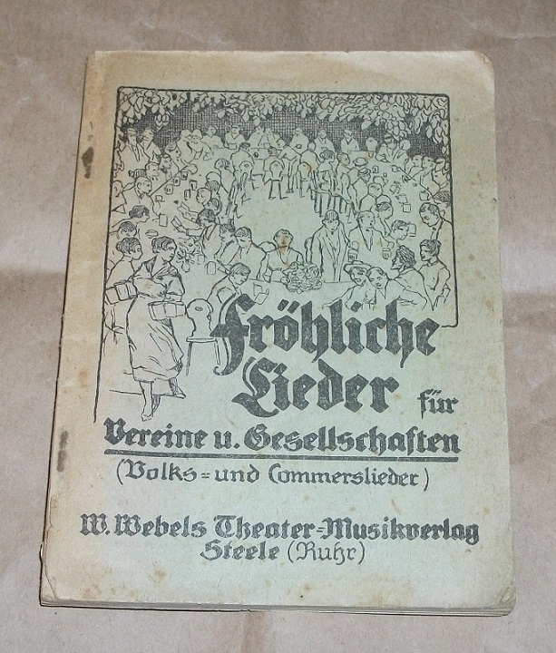 Goldmann, Curt: Fröhliche Lieder für Vereine und Gesellschaften (Volks- und Kommerslieder). Steele (Ruhr): W. Webels, Theater u. Musikverlag o.J. 15,5 cm, 93 S., altdeutsche Schrift. Geheftet. Deutliche Gebrauchsspuren. Beschädigt, fleckig, bestoßen.