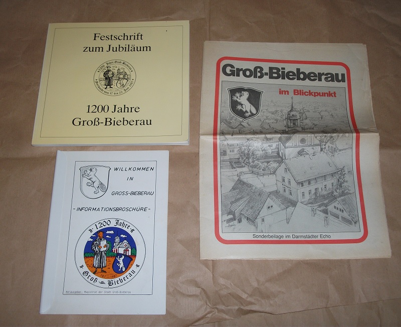 Magistrat der Stadt Groß-Bieberau (Hrsg.): 1200 Jahre Gross-Bieberau. Beiträge zu seiner Geschichte. Zusammenfassung in engl., franz. + ungarischer Sprache. Gross-Bieberau: Magistrat d. Stadt, 1987. 24 cm, VI, 349 S. , Ill., graph. Darst., Kt. Ln., SU. Leichte Gebrauchsspuren.