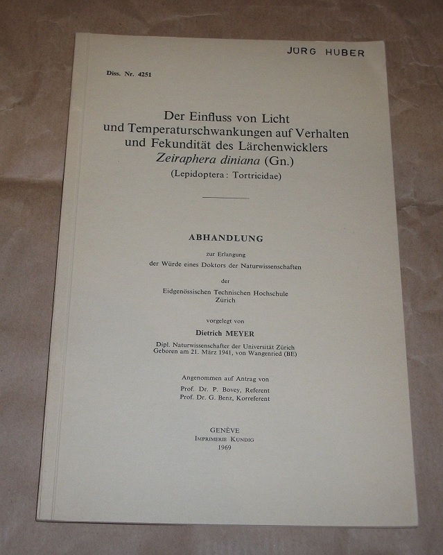 Meyer, Dietrich: Der Einfluss von Licht und Temperaturschwankungen auf Verhalten und Fekundität des Lärchenwicklers Zeiraphera diniana <Gn.>. <Lepidoptera: Tortricidae>. Diss. Nr. 4251. Sonderdruck. Geneve: Kundig, 1969. 24 cm, S. 93-141.mit Abb. Kart. Name a. Umschlag, Ecken etw. bestoßen. Gut erhalten. Revue Suisse de Zoologie, Tome 76, 1969.