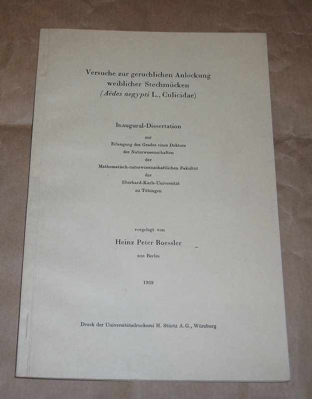 Roessler, Heinz Peter: Versuche zur geruchlichen Anlockung weiblicher Stechmücken (Aedes aegypti L., Culicidae). Inaugural-Dissertation. Sonderdruck. Würzburg: Stürtz 1959. 23 cm, S. 185 – 231 Ill. Kart. Ecken etw. bestoßen. Leichte Gebrauchsspuren. Zeitschrift für vergleichende Physiologie 44, (1961) Auf dem Titelblatt mit handschriftlichem Vermerk: „Mit den freundlichsten Grüßen und Dank vom Verfasser“ und in anderer Schrift: „Tropenmediz. Institut der Universität Tübingen“.