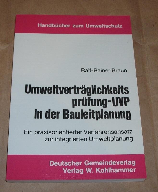 Braun, Ralf-Rainer: Umweltverträglichkeitsprüfung – UVP in der Bauleitplanung. Ein praxisorientierter Verfahrensansatz zur integrierten Umweltplanung. Köln/Köln: Dt. Gemeindeverl/Kohlhammer, 1987. 21 cm. 246 S. 22 graph. Darst. Kart. Leichte Gebrauchsspuren. Handbücher zum Umweltschutz.