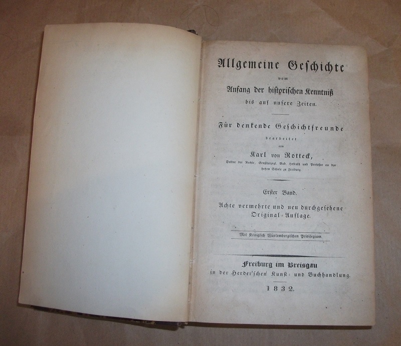 Rotteck, Karl von: Allgemeine Geschichte. Band 1-10 in 5 Bänden. Vom Anfang der historischen Kenntniß bis auf unsere Zeiten. Für denkende Geschichtsfreunde bearbeitet. 8., vermehrte u. neu durchgesehene Original-Ausgabe 5 Bände. Freiburg i. Br.: Herder 1832 21 cm, HLdr. Einbände mit starken Gebrauchsspuren. Rücken an den Kanten aufgeplatzt, dadurch Einbanddeckel z.T. gelockert. Kapitale u. Ecken bestoßen / beschädigt. Schnitte gebräunt. Aus Raucherhaushalt.