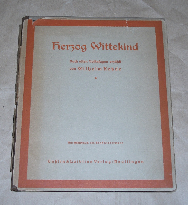 Kotzde, Wilhelm: Herzog Wittekind. Nach den alten Volkssagen erzählt. Mit Illustrationen von Ernst Liebermann. Reutlingen: Enßlin & Laiblin, (1923). 21,5 cm, 96 S. mit Ill. Hln., SU. stark beschädigt, Reste liegen bei. Vorsatzpapier braunfleckig, sonst gut erhalten.