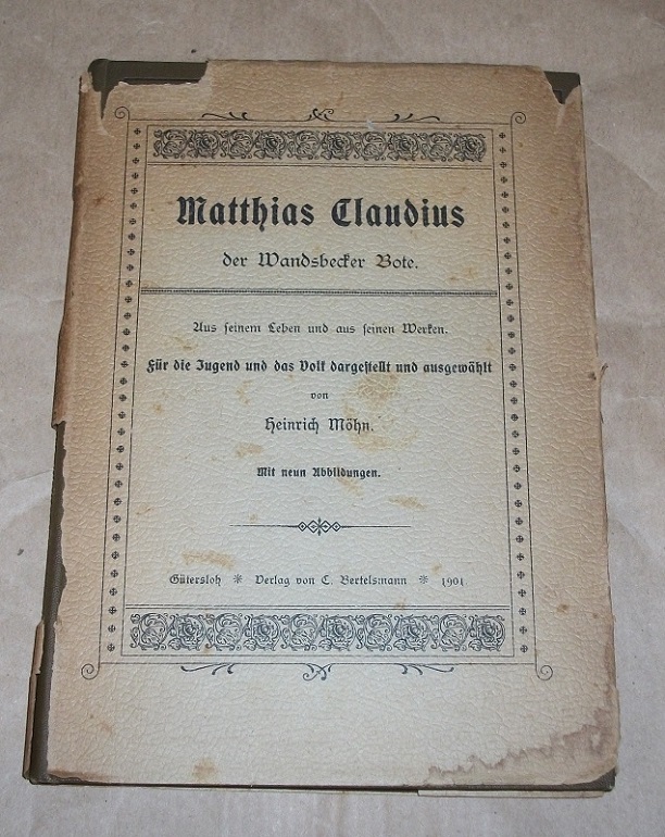 Claudius, Matthias: Matthias Claudius, der Wandsbecker Bote. für die Jugend und das Volk dargestellt und ausgewählt von Heinrich Möhn. aus seinem Leben und aus seinen Werken.. Gütersloh: Bertelsmann, 1901. 19 cm, 112 S. mit Ill., altdeutsche Schrift. Ill. Ln., SU. SU. stark beschädigt / fleckig, Reste liegen bei. Einband u. Schnitt etw. fleckig. Sonst gut erhalten.