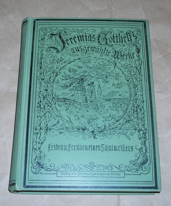 Gotthelf, Jeremias: Leiden und Freuden eines Schulmeisters. Neue Stereotyp-Ausgabe. Erster + Zweiter Band in 1. Berlin: Julius Springer, 1905 18 cm, 214 / 250 S., altdeutsche Schrift. Ill. Ln. Kapitale bestoßen, etwas schief gelesen, Schnitt gebräunt u. gering fleckig. Name u. Ex-Libris im Vorsatz. Ausgewählte Werke.