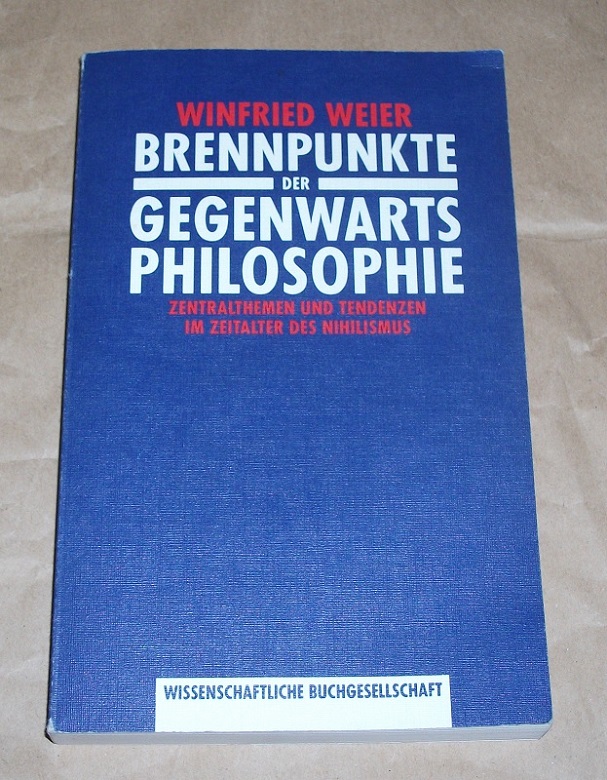 Weier, Winfried: Brennpunkte der Gegenwartsphilosophie. Zentralthemen und Tendenzen im Zeitalter des Nihilismus. Darmstadt: Wissenschaftliche Buchgesellschaft 1991. 22 cm. X, 274 S. Kart. Kanten etw. berieben / bestoßen. Anstreichungen / Anmerkungen mit Bleistift bis S. 8. Gut erhalten.
