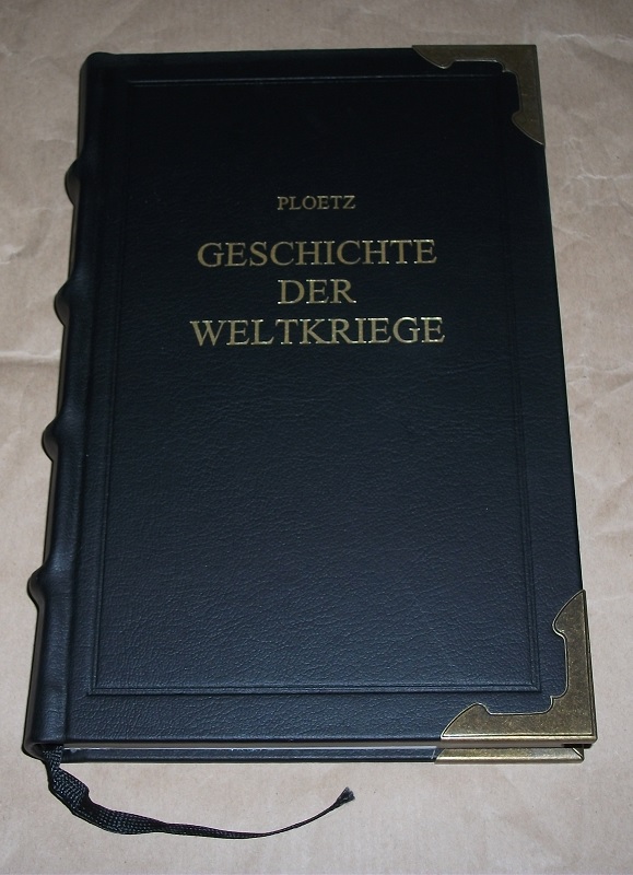 Ploetz: Geschichte der Weltkriege. Limitierte Vorzugsausgabe. Mächte, Ereignisse, Entwicklungen, 1900 – 1945. Frechen: Komet, 2002. 24 cm, 304 S. Ill., graph. Darst., Kt. Leder mit Metallecken. Leichte Gebrauchsspuren. Exemplar Nr. 352 von 499 der limitierten Vorzugsausgabe.