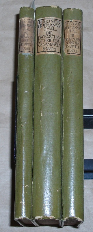 Hofmannsthal, Hugo von: Die prosaischen Schriften gesammelt Band 1-3. In 4 ( 3 ) Bänden. [ In Band 1+2 steht vier Bänden, in Band 3 steht drei Bänden]. 4. Tsd. / 1.-2. Tsd. / 1.-3. Aufl. 3 Bände Berlin: S. Fischer, 1918 / 1907 / 1917 19 cm, 145 / 187 / 195 S., Ppde. mit Rückenschild, Farbschnitt. Einbände mit Gebrauchsspuren (Kapitale bestoßen / berieben. Aus Raucherhaushalt. Sonst gut erhalten.