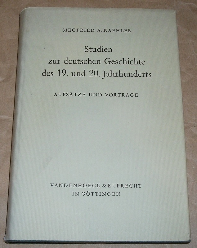 Kaehler, Siegfried A.: Studien zur deutschen Geschichte des 19. und 20. Jahrhunderts. Aufsätze u. Vorträge. Göttingen: Vandenhoeck & Ruprecht, 1961. 23,5 cm, 418 S. Ln., SU. SU. mit Gebrauchsspuren / Randläsuren. Schnitt gebräunt, Name a. V., z.T. Anstreichungen / Anmerkungen mit Bleistift (radierbar). Sonst gut erhalten.