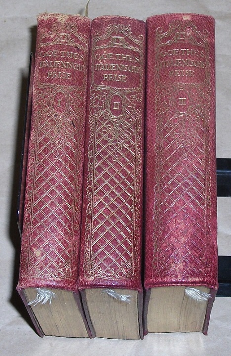 Goethe: Goethes Italienische Reise. Band 1-3 (komplett). Textrevision, Einleitungen u. Anmerkungen von Dr. G. von Graevenitz. 3 Bände. Berlin: S. Fischer, o.J. 13 cm, Mit Abb. a. Tafeln. Leder, Goldschnitt. Oberes Kapital (etw.) beschädigt, Einband (vor allem am Rücken) berieben. Ex-Libris a. V. (Pantheon-Ausgabe). Mit Ex-Libris von Dr. Phil. Heinz Goldammer.
