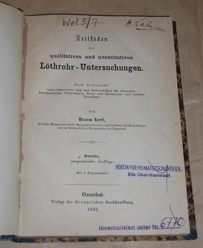 Kerl, Bruno: Leitfaden bei qualitativen und quantitativen Löthrohr-Untersuchungen. Zum Gebrauche beim Unterrichte u. z. Selbststudium f. Chemiker, Pharmaceuten, Mineralogen, Berg- und Hüttenleute und sonstige Techniker; M. 1 Taf. 2. umgearb. Auflage. Clausthal: Grosse, 1862. 8°. VII, 158 S. mit 1 Taf. HLn. mit handschriftl. Rückenschild. Ehem. Bibliotheks-Exemplar mit entsprechenden Kennzeichen. Kapitale etw. bestoßen, Schnitt gebräunt. z.T. alte handschriftliche Anmerkungen am Seitenrand. Gut erhalten.