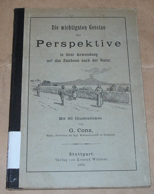 Conz, Gustav: Die wichtigsten Gesetze der Perspektive in ihrer Anwendung auf das Zeichnen nach der Natur. 1. Aufl. Stuttgart: Wittwer, 1895. 18,5 cm, VI ,87 S. Ill. HLn. Ehem. Bibliotheks-Exemplar mit entsprechenden Kennzeichen. Kanten etw. berieben / bestoßen. Schnitt gebräunt u. etw. fleckig. Name u. eingeklebte Kopf-Skizze im Vorsatz. z.T. Anstreichungen mit Bleistift.