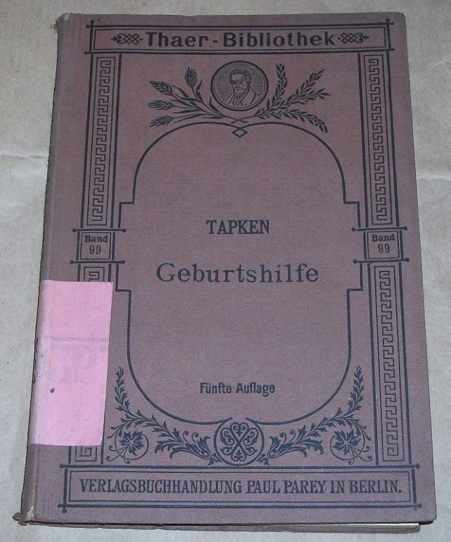 Tapken, Anton: Geburtshilfe. Für Landwirte. 5., durchges. u. erg. Aufl. / hrsg. von Leonhard Schmidt. Berlin: Parey, 1921. 8. VIII, 174 S. Mit 33 Textabb. Ppd. Einband mit handschriftlichem Rückenschild, Stempel a. Titel u. Vorsatz. Kapitale bestoßen / etw. beschädigt. Vorsatz u. Schnitt gebräunt u. braunfleckig. Thaer-Bibliothek, Bd. 99.