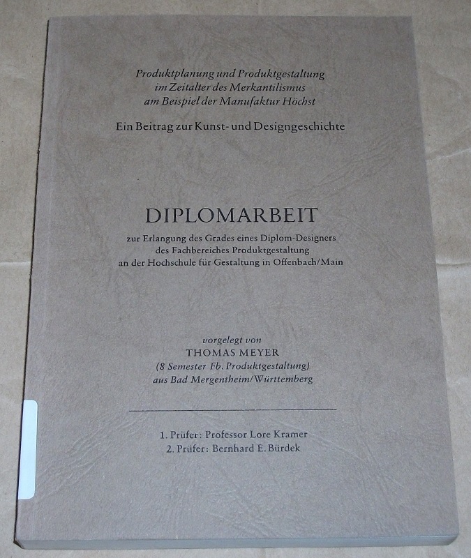 Meyer, Thomas: Produktplanung und Produktgestaltung im Zeitalter des Merkantilismus am Beispiel der Manufaktur Höchst. Ein Beitrag zur Kunst- u. Designgeschichte. Frankfurt [Main], Fichardstr. 27, T. Meyer [Selbstverl.], 1976. 21 cm. 236 S. Ill. Kart. ehem. Bibliotheks-Exemplar mit entsprechenden Kennzeichen. Einband am Rücken etw. verblichen, Schnitt fleckig / angeschmutzt. Innen sauber und gut erhalten.
