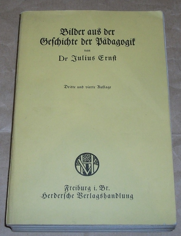 Ernst, Dr. Julius: Bilder aus der Geschichte der Pädagogik für Lehrerbildungsanstalten. 3. + 4., umgearbeitete u. erweiterte Aufl. Freiburg [u.a.]: Herder, 1914. 20 cm, XV,360 S., altdeutsche Schrift. Kart. Umschlag mit Knickspuren, Rücken etw. rund vom lesen. Ecken etw. bestoßen, Schnitt gebräunt. Gut erhalten.