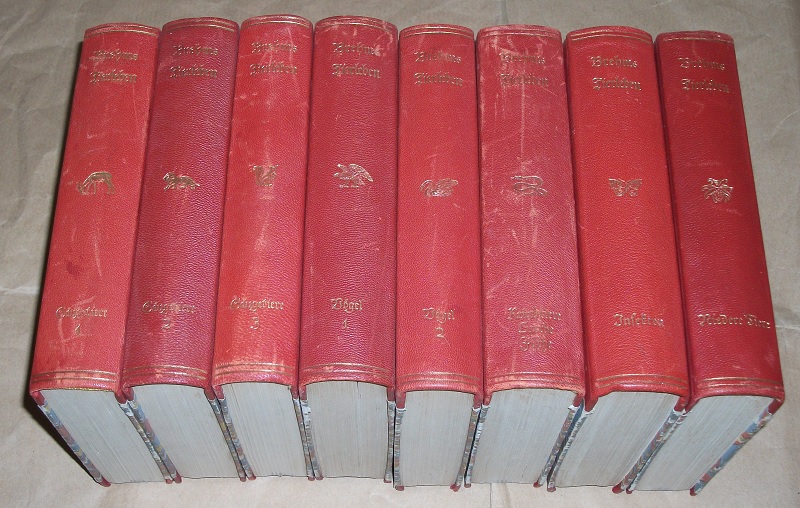 Brehm, Alfred Edmund: Tierleben. Jubiläums-Ausgabe in acht Bänden. Band 1 -8 (Komplett). Nach dem neuesten Stand der Wissenschaft bearbeitet und in Auswahl hrsg. von Carl W. Neumann.. Acht Bände. Leipzig: Reclam, 1938-39. 19,5 cm, Mit 64 Farbentafeln u. 160 schwarzen Doppel-Bildtafeln. Altdeutsche Schrift. HLdr. mit Kopffarbschnitt. Einbände am Rüken / Kanten berieben, Ecken / Kapitale etw. bestoßen. Schnitt gebräunt u. etw. fleckig. Insgesamt gut erhalten.