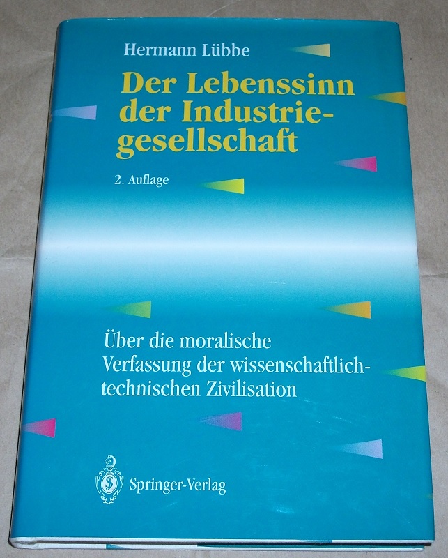 Lübbe, Hermann: Der Lebenssinn der Industriegesellschaft. über die moralische Verfassung der wissenschaftlich-technischen Zivilisation. 2. Aufl. Berlin/Heidelberg/New York/London/Paris/Tokyo/Hong Kong/Barcelona/Budapest, Springer, 1994. 25 cm. X, 224 S. Ppd., SU. SU. etw. berieben. Schnitt etw. fleckig / angeschmutzt. Riecht etw. muffig. Gut erhalten. Edition ALCATEL-SEL-Stiftung.