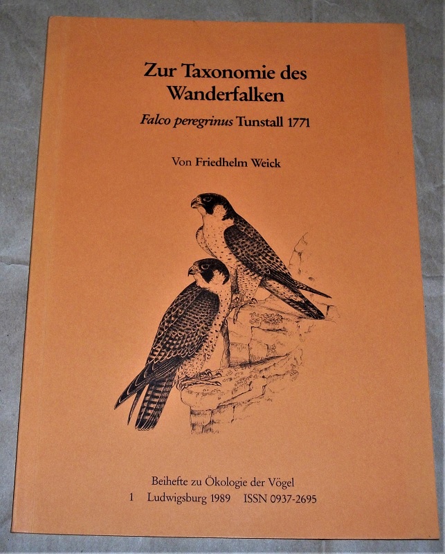 Weick, Friedhelm: Zur Taxonomie des Wanderfalken Falco peregrinus Tunstall 1771. Ludwigsburg: J. Hölzinger, 1989. 22 cm, 42 Seiten Zeichnungen. Kart. Leichte Gebrauchsspuren. Ökologie der Vögel, Beiheft 1.