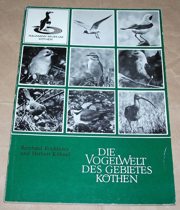 Rochlitzer, Reinhard u. Herbert Kühnel: Die Vogelwelt des Gebietes Köthen. Eine Übersicht. Köthen: Naumann-Museum 1979. 24 cm, 131 S. Ill., graph. Darst. Kart. Einband berieben, auf Rücken Titel (mit Schreibmaschine geschrieben) aufgeklebt. Sonst gut erhalten. Monographien aus dem Naumann-Museum, 1.