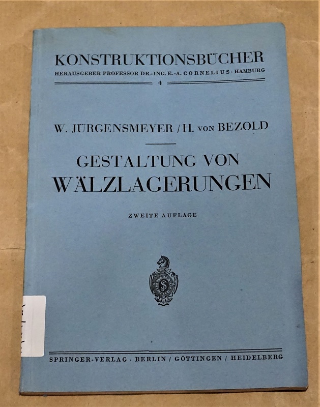Jürgensmeyer, Wilhelm: Gestaltung von Wälzlagerungen. 2. Aufl., bearb. von H. von Bezold. Berlin/Göttingen/Heidelberg, Springer, 1953. 8. V, 106 S. Mit 162 Abb. Kart. Ehem. Bibliotheks-Exemplar mit entsprechenden Kennzeichen. Einband fleckig, Block gebogen, Schnitt gebräunt. Name a. T. Konstruktionsbücher, 4.