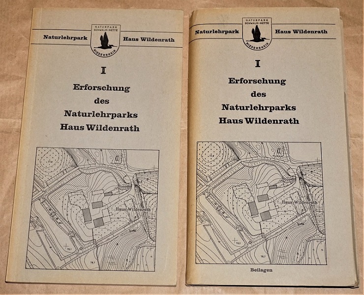 Naturlehrpark Haus Wildenrath 1. Erforschung des Naturlehrparks Haus Wildenrath / [Hrsg.: Landschaftsverb. Rheinland gemeinsam mit d. Kreis Erkelenz. Red.: F. W. Dahmen] [Hauptbd.]. Köln: Rheinland-Verlag, 1969. 24 cm, 84 S. Kt. + Mappe mit Beilagen. Kart. Umschläge u. Schnitt gebräunt, Name a. V. Die Mappenkanten bestoßen. Sonst leichte Gebrauchsspuren. Beiträge zur Landesentwicklung, Nr. 2, 1.