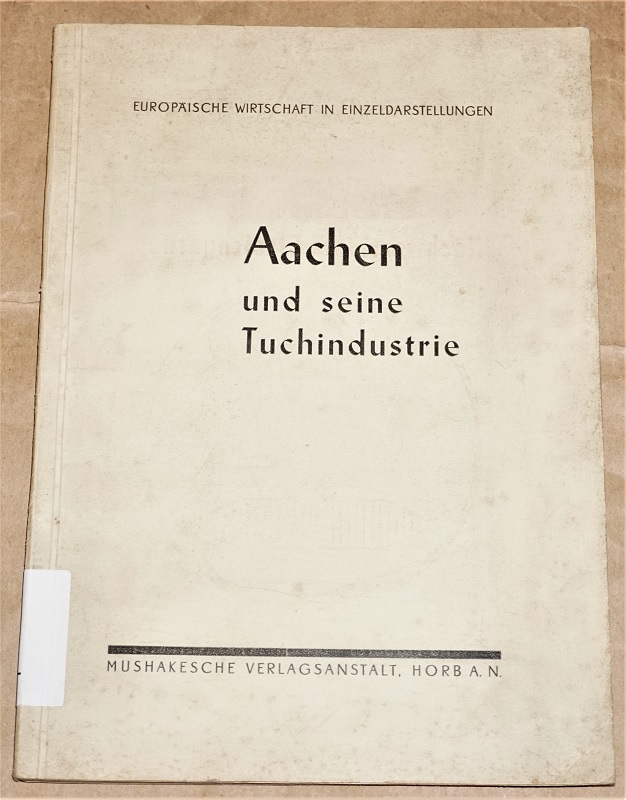 Bruckner, Clemens: Aachen und seine Tuchindustrie. Horb a. N.: Mushake, 1949. 8. 80 S. mit Abb. Kart. Ehemaliges Bibliotheks-Exemplar mit entsprechenden Kennzeichen. Umschlag angeschmutzt / fleckig, Ecken bestoßen, Schnitt gebräunt. Innen sauber. Europäische Wirtschaft in Einzeldarstellungen.