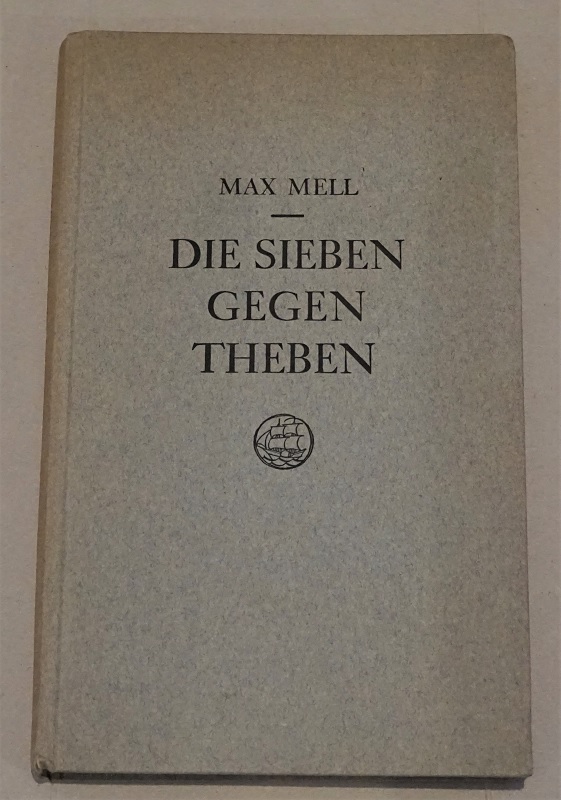 Mell, Max: Die Sieben gegen Theben. Dramatische Dichtung. Widmungsexemplar. EA. Leipzig: Insel-Verl., 1932. 8. 155 S. Ppd. Ecken u. Kapitale bestoßen, Einband u. Schnitt gebräunt. Gut erhalten. Mit Widmung vom Autor im Vorsatz, datiert 1932. Signiert. EA WG II 30.