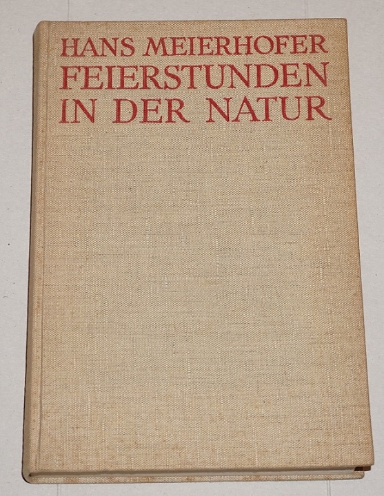 Meierhofer, Hans: Feierstunden in der Natur. Laiengedanken eines Naturfreundes. Zürich: Fretz & Wasmuth 1928. 20 cm, 222 S., 16 Taf. in Kupfertiefdr., 23 ganzseit. Federzeichnungen d. Verfassers. Ln. Einband gebräunt / braunfleckig, Rückenbeschriftung ausgeblichen, Schnitt gebräunt. Sonst gut erhalten.