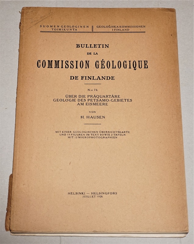 Hausen, Hans: Über die präquartäre Geologie des Petsamo-Gebietes am Eismeere. mit e. geologischen Übersichtskt. u. 13 Fig. im Text sowie 2 Taf. mit 12 Mikrophotographien. Helsinki: Impr. de l’État, 1926. 8°. 100 S., 2 Taf. 25 Ill., 1 Kt. Kart. Deutliche Gebrauchsspuren. Umschlag am Rücken beschädigt und lose. Umschlag u. Schnitt gebräunt, Name a. T. Bulletin de la Commiss Géologique de Finlande, No. 76.