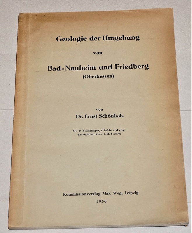 Schönhals, Dr. Ernst: Geologie der Umgebung von Bad-Nauheim und Friedberg (Oberhessen). Ohne die geologische Karte! Leipzig: Weg, 1936. 27 cm, 134 S. , Ill., Taf. Kart. Mit deutlichen Gebrauchsspuren. Karte fehlt.