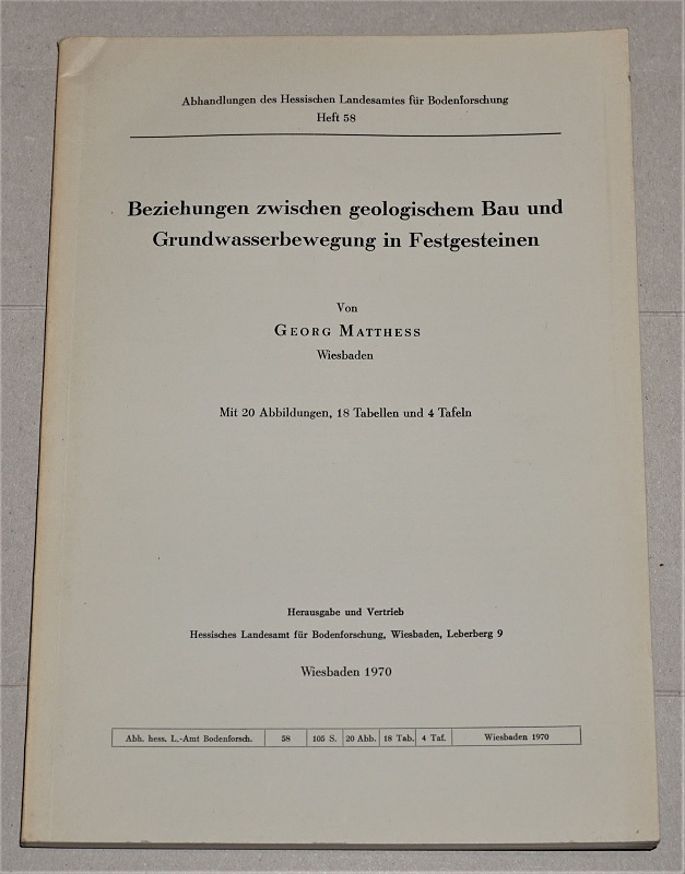Matthess, Georg: Beziehungen zwischen geologischem Bau und Grundwasserbewegung in Festgesteinen. Wiesbaden: Hess. Landesamt f. Bodenforschung, 1970. gr. 8. 105 S., 6 Bl. mit Abb. u. Ktn. Mit 20 Abb., 18 Tab. u. 4 Taf. Kart. Oberes Kapital gestaucht / geknickt, Rücken gebräunt u. etw. fleckig. Sonst gut erhalten / innen sauber. Abhandlungen des Hessischen Landesamtes für Bodenforschung, H. 58.