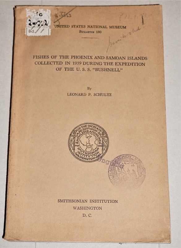 Schultz, Leonard Peter: Fishes of the Phoenix and Samoan islands collected in 1939 during the expedition of the U. S. S. „Bushnell,“. Washington: U.S. Govt. Print. Off, 1943. 23 cm. 316.p illus. Kart. Ehemaliges Bibliotheks-Exemplar mit entsprechenden Kennzeichen. Deutliche Gebrauchsspuren. Schnitt gebräunt u. fleckig, Ecken u. Kanten bestoßen. Innen sauber. Riecht muffig. Smithsonian institution. United States National museum. Bulletin 180.