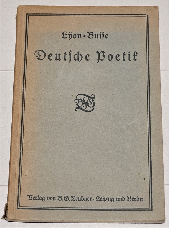 Lyon, Otto / Busse, Br.: Deutsche Poetik im Abriß. Aus Otto Lyons Handbuch der deutschen Sprache für höhere Schulen (Teil II, Abt. 2). 8., völlig neu bearb. Aufl. von Br. Busse. Leipzig ; Berlin: Teubner, 1915. 21 cm, VIII S, S. 190 – 278. Kart. Rücken am unteren Kapital beschädigt, Umschlag u. Schnitt gebräunt, Ecken bestoßen.