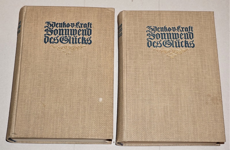 Kraft, Zdenko von: Sonnwend des Glücks. Die Symphonie e. Lebens ; Roman in 4 Sätzen. 2 Bände (komplett). 2 Bände. Berlin: Bong, 1917 8. 494 / 467 S., altdeutsche Schrift. Ln. Einband u. Schnitt gebräunt / etw. angeschmutzt / fleckig. Band 1 Einbandecken bestoßen, Vorsatz- u. Titelblatt wieder eingeklebt (sauber).