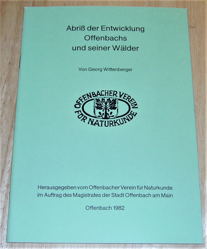 Wittenberger, Georg. Abriss der Entwicklung Offenbachs und seiner Wälder. Offenbach: Offenbacher Verein für Naturkunde, 1982. 21 cm. 48 S. Ill., Kt. Geheftet. Leichte Gebrauchsspuren. Abhandlung des Offenbacher Vereins für Naturkunde, Band 5.