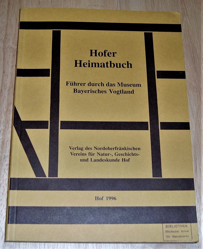 Hofer Heimatbuch. Führer durch das Museum Bayerisches Vogtland. Hof: Nordoberfränk. Verein für Natur-, Geschichts- und Landeskunde, 1996. 21 cm. 247 S. Ill., graph. Darst. Kart. Leichte Gebrauchsspuren. Kl. Stempel a. Umschlag u. Titel. Aus der aufgelösten Bibliothek des Offenbacher Vereins für Naturkunde.