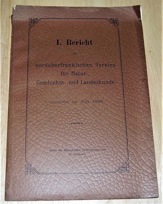 I. Bericht des Nordoberfränkischen Vereins für Natur-, Geschichts- und Landeskunde erstattet im Juli 1896. Hof: Nordoberfränkischer Verein für Natur-, Geschichts- und Landeskunde e.V, 1896-. 22,5 cm, 110 S. mit 2 gefalteten Beilagen. Kart. Deutliche Gebrauchsspuren. Umschlag eingerissen / mit Randläsuren, Rücken mit Fehlstelle am oberen Kapital, Ecken bestoßen / geknickt. Stempel a. Titel + Beilagen. …Bericht des Nordoberfränkischen Vereins für Natur-, Geschichts- und Landeskunde, 1 Aus der aufgelösten Bibliothek des Offenbacher Vereins für Naturkunde.