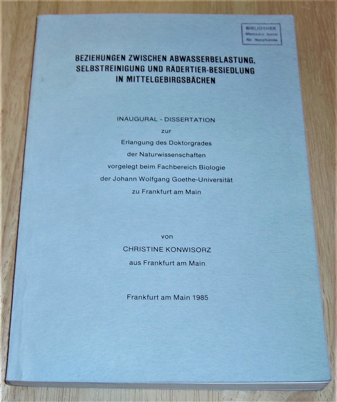 Konwisorz, Christine: Beziehungen zwischen Abwasserbelastung, Selbstreinigung und Rädertier-Besiedlung in Mittelgebirgsbächen. Inaugural-Dissertation zur Erlangung des Doktorgrades der Naturwissenschaften vorgelegt beim Fachbereich Biologie der Johann Wolfgang Goethe-Universität zu Frankfurt / M. Frankfurt / M.: 1985 21 cm. II, 194 S graph. Darst. Kart. Oberer Schnitt braunfleckig, Stempel a. Umschlag + Titel. Sonst gut erhalten. Aus der aufgelösten Bibliothek des Offenbacher Vereins für Naturkunde.