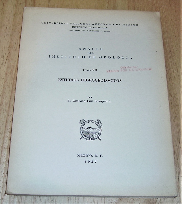 Blásquez López, Luis: Estudios hidrogeológicos. México, D. F.: Universidad Nacional Autónoma de México. Inst. de Geología, 1957. 8°. VIII, 148 S Ill., Kt. Kart. Umschlag / Schnitt angeschmutzt / gebräunt. Ecken u. Kapitale bestoßen / geknickt. Stempel a. Umschlag + Titel. Anales del Instituto de Geología, 12. Aus der aufgelösten Bibliothek des Offenbacher Vereins für Naturkunde.