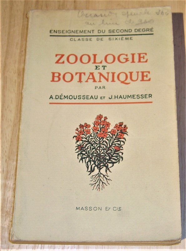 Démousseau, A. et J. Haumesser: Zoologie et Botanique. Classes de sixième. Cinquième Édition. Paris: Masson et cie 1953 19 cm, 353 S. mit Ill. TB. Deutliche Gebrauchsspuren. Umschlag / Schnitt gebräunt + angeschmutzt, Umschlag vorne beschrieben, Ecken bestoßen. Innen sauber.