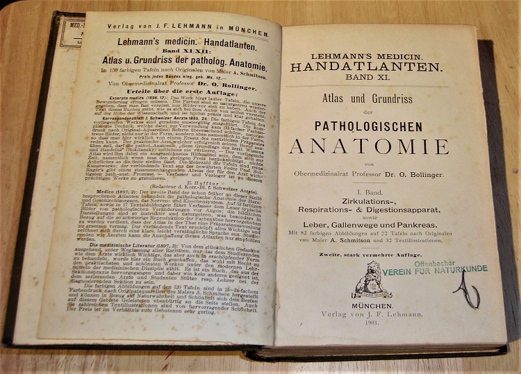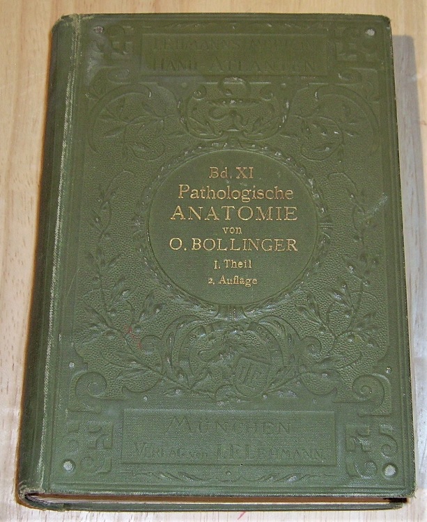 Bollinger, Otto.: Zirkulations-, Respirations- uns Digestionsapparat sowie Leber, Gallenwege und Pankreas. Atlas und Grundriss der pathologischen Anatomie, 1. 2., stark verm. Aufl. München: J. F. Lehmanns Verlag, 1901. 8“. VIII, 223 S. mit 82 farb. Abb. auf Tafeln nach Originalen von Maler A. Schmitson und 32 Textillustrationen. Geprägtes Ln. Deutliche Gebrauchsspuren. Einband berieben / fleckig / Ecken u. Kapitale bestoßen. Schnitt gebräunt und etw. fleckig. Die Vorsätze / Titel braunfleckig. Sonst innen sauber und gut erhalten. Lehmann´s medicin. Handatlanten Band XI.