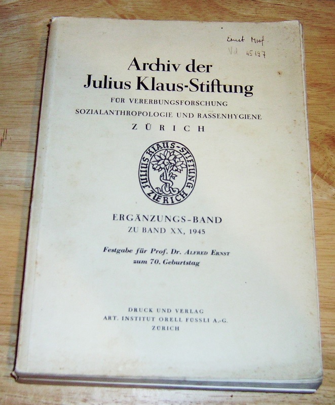 Festgabe zum 70. Geburtstag von Prof. Dr. Alfred Ernst. Zürich: Orell Füssli, 1945. 24,5 cm, 568 S. Kart. Deutliche Gebrauchsspuren. Umschlag u. Schnitt gebräunt u. fleckig, Name a. Umschlag. Rücken an den Kapitalen beschädigt und mit Knickspuren vom lesen. Ecken bestoßen. Innen sauber, keine Einträge / Anstreichungen. Archiv der Julius-Klaus-Stiftung für Vererbungsforschung, Sozialanthropologie und Rassenhygiene, Zürich, 20,Erg.Bd.