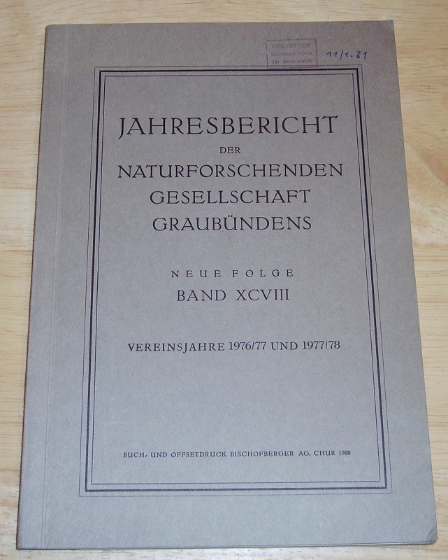 Naturforschende Gesellschaft Graubünden [Verfasser]: Jahresbericht der Naturforschenden Gesellschaft Graubündens Neue Folge Band XCVIII. Chur: Bischofberger 1980 22,5 cm, 118 S. mit Abb. Kart. Ecken bestoßen, kl. Stempel a. Umschlag. Sonst gut erhalten. Aus der aufgelösten Bibliothek des Offenbacher Vereins für Naturkunde.